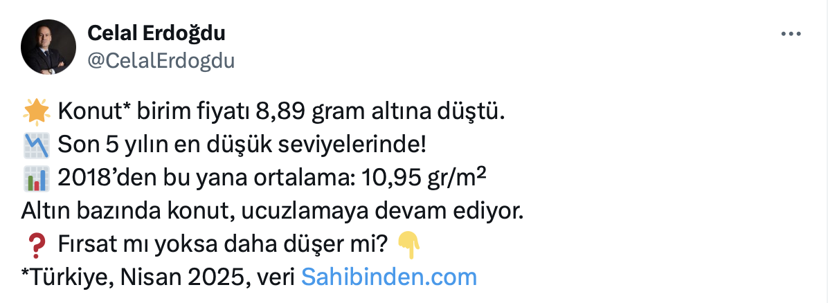 Celal Erdoğdu sosyal medya hesabı üzerinden yaptığı paylaşımda konut birim fiyatının 8,89 gram altına düştüğünü söyledi.