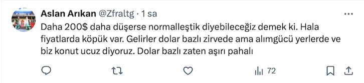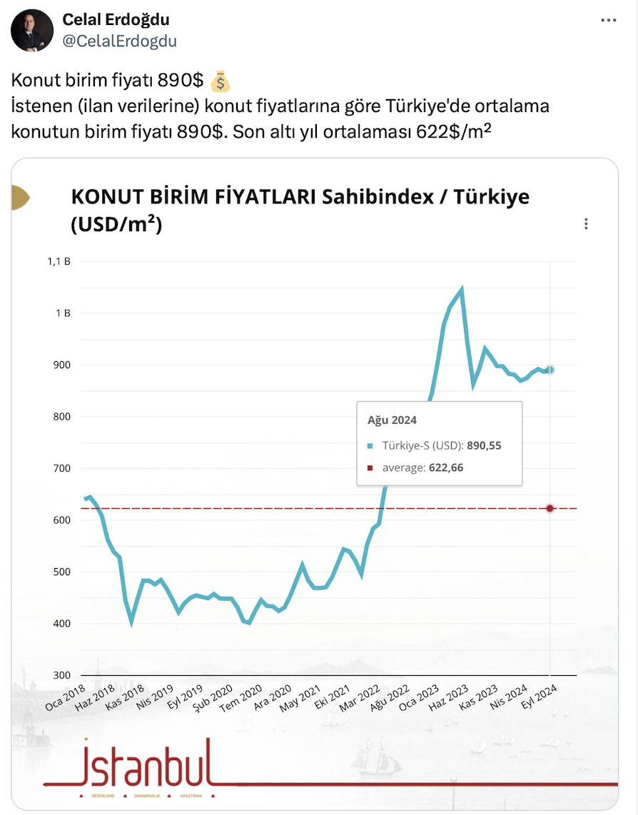 Şehir plancısı, gayrimenkul değerleme uzmanı Celal Erdoğdu resmi sosyal medya hesabı üzerinden yaptığı paylaşımda konut birim fiyatının 890 dolar olduğunu açıkladı.