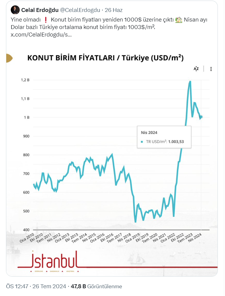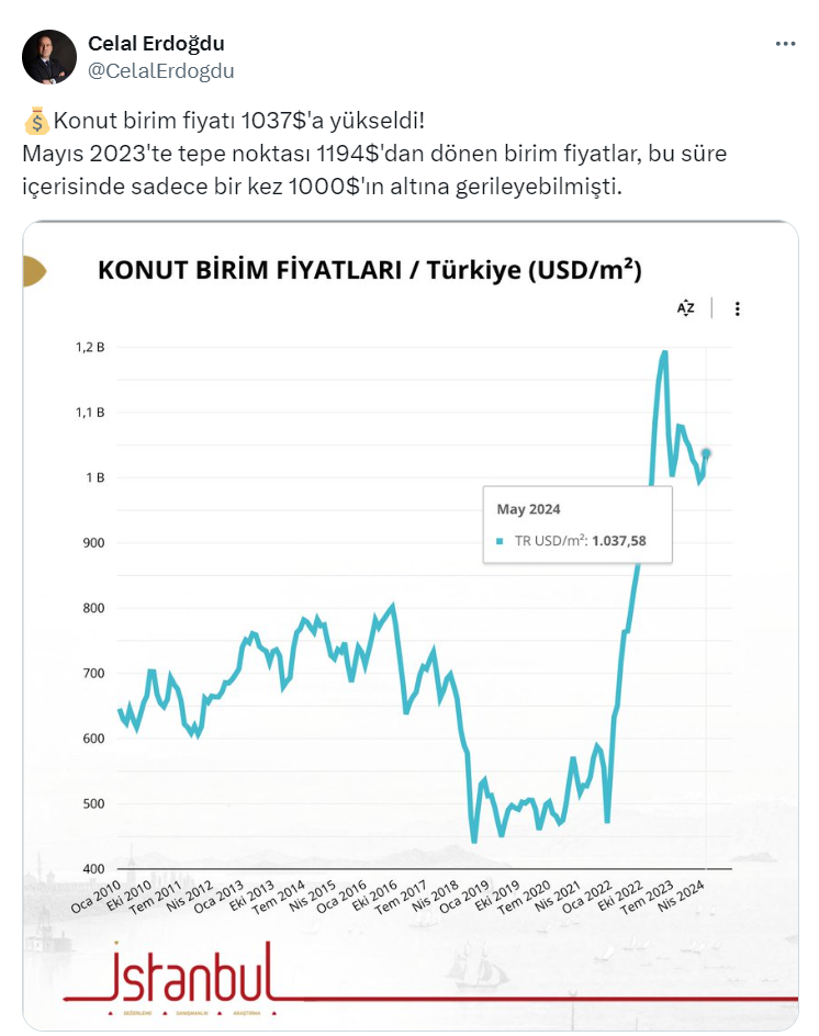 Celal Erdoğdu paylaşımında yaptığı paylaşımda konut birim fiyatının bin 37 dolara yükseldiğini açıkladı.