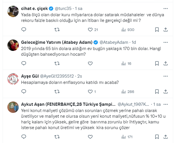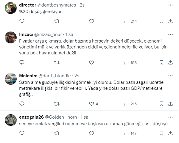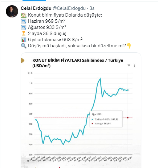 Erdoğdu, sosyal medya hesabı X'ten dolar bazlı konut fiyatlarının gerilediğini söyleyerek 'Düşüş mü başladı yoksa kısa bir düzeltme mi?' sorusunu takipçilerine sordu.