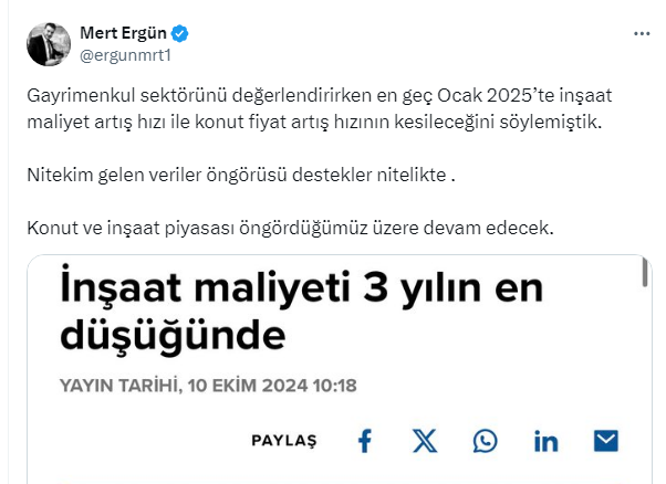 111 bin takipçili girişimci Mert Ergün https://x.com/ergunmrt1 X sosyal medya hesabından yaptığı paylaşımda, açıklanan rakamların konut piyasaındaki öngörülerini destekler nitelikte olduğunu söyledi. Ergün, “Gayrimenkul sektörünü değerlendirirken en geç Ocak 2025’te inşaat maliyet artış hızı ile konut fiyat artış hızının kesileceğini söylemiştik. Nitekim gelen veriler öngörüsü destekler nitelikte. Konut ve inşaat piyasası öngördüğümüz üzere devam edecek” dedi.