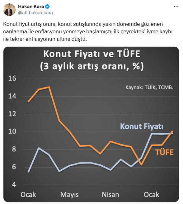 TCMB eski başekonomisti Prof. Dr. Ali Hakan Kara, sosyal medya hesabından konut fiyat endeksi verilerini değerlendirdi.