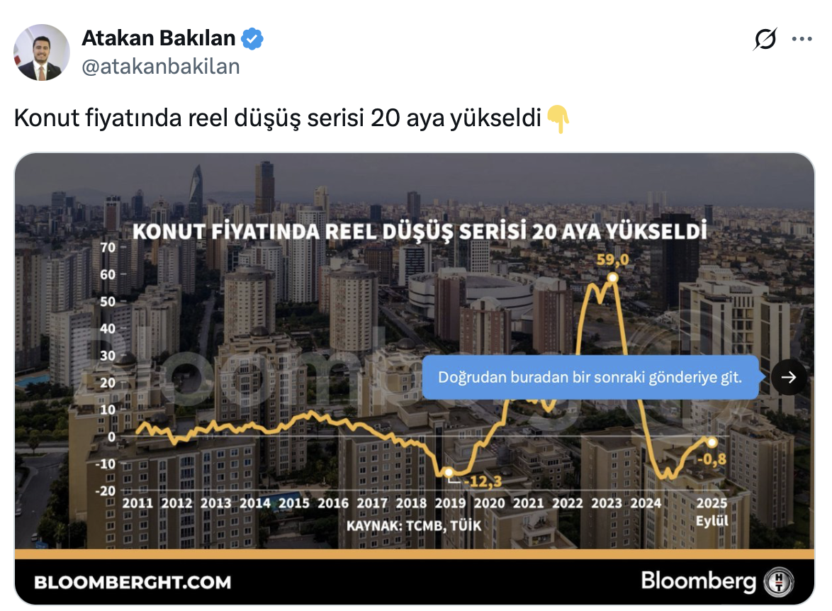 Atakan Bakılan yaptığı paylaşımda konut fiyatlarında reel düşüş serisinin 20 aya yükseldiğini belirtti.
