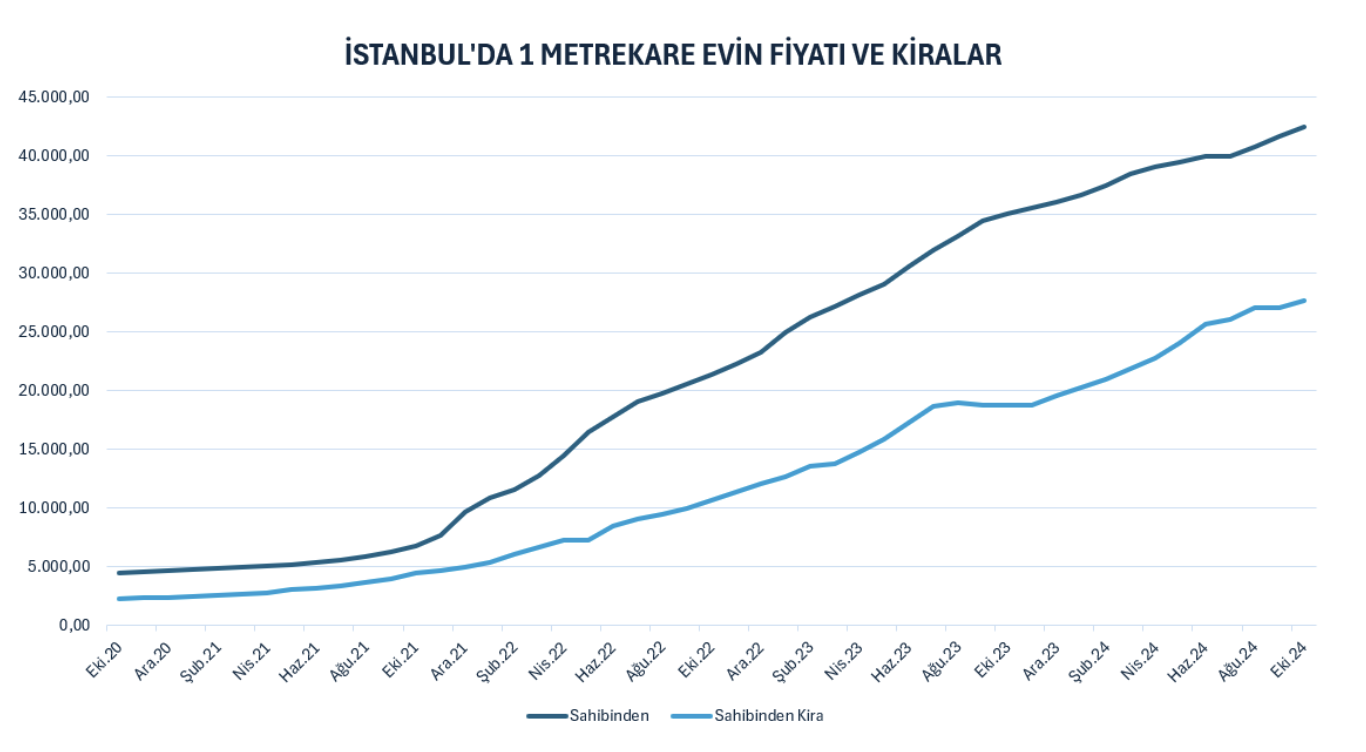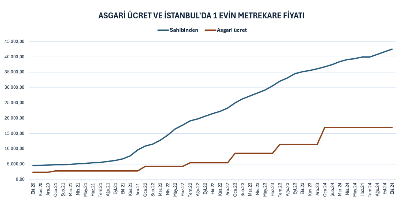 Mega kent İstanbul’da 1 metrekare ev fiyatı 2020 yılının Ekim ayında 4 bin 482 Türk Lirası olurken, bu yılın Ekim ayında 42 bin 528 Türk Lirası şeklinde oldu. Asgari ücret ile fark da açıldı.