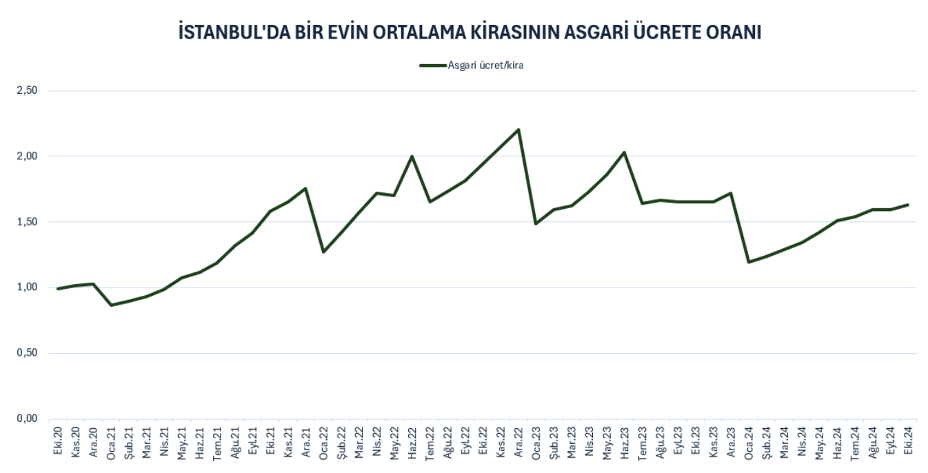 Mega kent İstanbul’da ortalama bir evin kirası 2020 yılının Ekim ayında 2 bin 308 Türk Lirası şeklinde olurken, 2024 yılının Ekim ayında 27 bin 733 Türk Lirası şeklinde oldu. 4 sene önce 2 bin 234,71 Türk Lirası şeklinde olan asgari ücretle bir evin kirası ödenebiliyor veya asgari ücretin İstanbul’un ortalama kirasına oranı 0,99 oluyordu. 2022 yılının Aralık ayında söz konusu bu oran 2,20’ye çıkarken, bu yılın Ekim ayında 1,63 seviyesinde bulunuyor ki asgari ücretli kira ödeyemiyor.