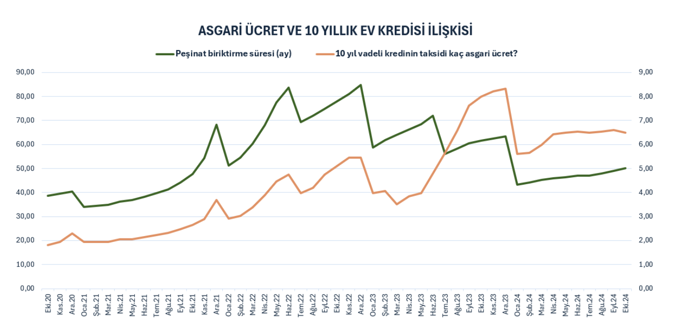 Yüzde 20 peşinatla konut almak istese 100 metrekare bir konutun peşinatı biriktirmek 2020 yılının Ekim ayında 38,6 ay sürerken, bu yılın Ekim ayında 50 ay sürüyor. Konut kredisi oranlarına göre, ekonomimcom’um TCMB EVDS verilerinden derlediği aylık ortalama verilere göre, aylık kredi taksitleri 2020 yılının Ekim ayında yıllık yüzde 15,07 olan faiz oranlarına göre yaklaşık olarak 1,82 oranında olurken, 2024 yılının Ekim ayında yüzde 41,52 olan faizlerle 6,49 asgari ücret ediyor.