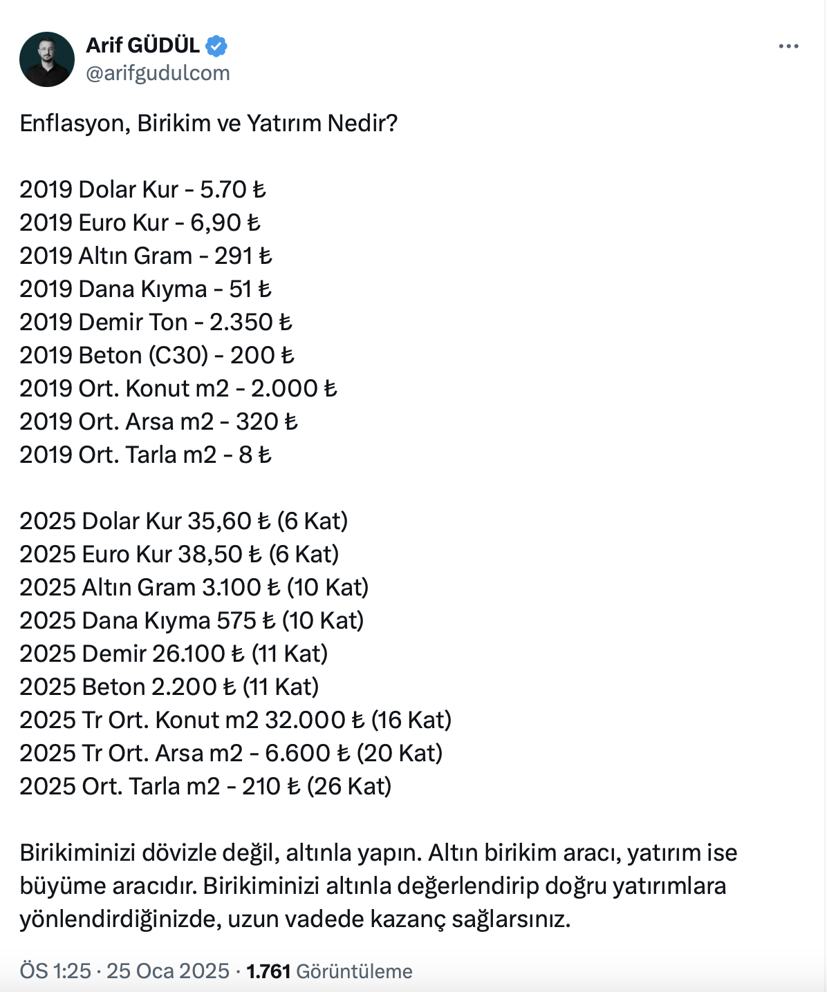 Arif Güdül resmi sosyal medya hesabı https://twitter.com/arifgudulcom üzerinden yaptığı paylaşımda 2019 yılında konutların metrekaresinin 2 bin TL olduğunu, 2025 yılında bu fiyatın 16 kat artarak, 32 bin TL’ye çıktığını belirtti.