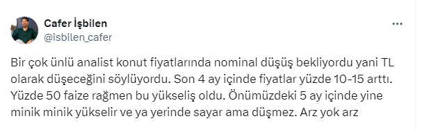 Konut fiyatlardaki artışın süreceğini söyleyen analist ve stratejist Cafer İşbilen bunun nedenini de arzın olmayışıyla açıkladı. İşbilen https://x.com/isbilen_cafer hesabından yaptığı paylaşımda, “Birçok ünlü analist konut fiyatlarında nominal düşüş bekliyordu yani TL olarak düşeceğini söylüyordu. Son 4 ay içinde fiyatlar yüzde 10-15 arttı. Yüzde 50 faize rağmen bu yükseliş oldu. Önümüzdeki 5 ay içinde yine minik minik yükselir ve ya yerinde sayar ama düşmez. Arz yok arz” dedi.