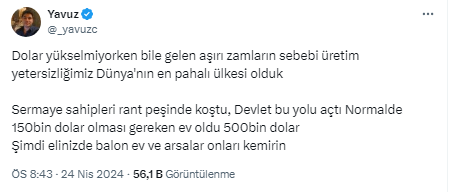 Konut fiyatlarındaki fahiş artış ülke genelinde büyük sorun haline geldi. Konut fiyatlarının olması gerekenin 3 katından fazlaya satıldığını söyleyen Makine mühendisi Yavuz isimli kullanıcı, X sosyal medya hesabından değerlendirme yaptı.
