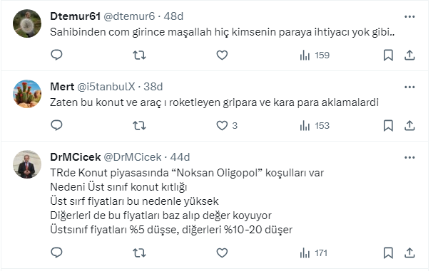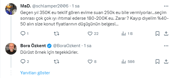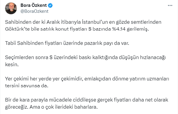 Yatırımcı Bora Özkent, twitter.com/BoraOzkent X sosyal medya hesabından yaptığı paylaşımda, İstanbul’un en gözde semtlerinden Göktürk’te bile satılık konut fiyatlarında dolar bazında yüzde 4.14 gerileme olduğunu belirtti. Fiyatlarda pazarlık yapma şansının da olduğunu ifade eden Özkent, fiyatların hızla düşeceğini söyledi.