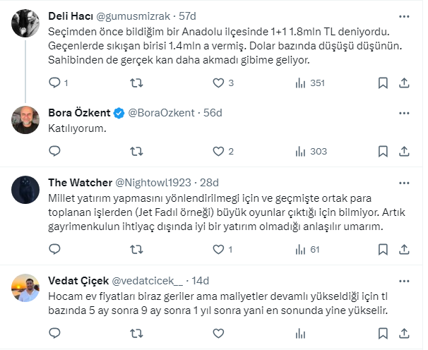 Kredi faizlerinin artışı, yüksek fiyatlar nedeniyle ev sahibi olmak her geçen gün zorlaşırken piyasadaki durgunluk devam ediyor. Yatırımcı Bora Özkent X sosyal medya hesabından yaptığı paylaşımda, dolar bazlı fiyat düşüşünün başladığını belirterek, fiyatların hızla gerileceğini söyledi.