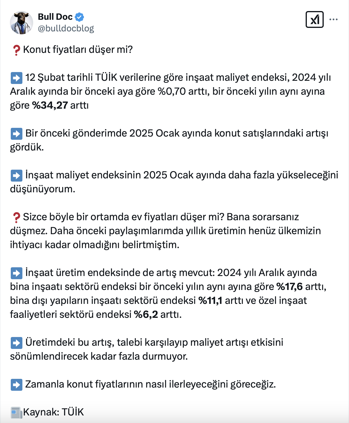 Paylaşımında “Konut fiyatları düşer mi” sorusuna yanıt veren Analist Bull Doc, konut fiyatlarının düşmeyeceğini belirtti.