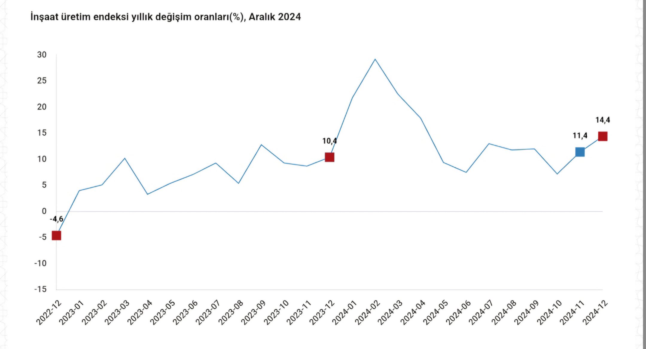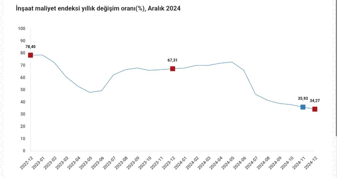 12 Şubat tarihli TÜİK verilerine göre inşaat maliyet endeksi, 2024 yılı Aralık ayında bir önceki aya göre %0,70 arttı, bir önceki yılın aynı ayına göre %34,27 arttı