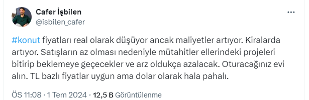 #konut fiyatları real olarak düşüyor ancak maliyetler artıyor. Kiralarda artıyor. Satışların az olması nedeniyle mütahitler ellerindeki projeleri bitirip beklemeye geçecekler ve arz oldukça azalacak. Oturacağınız evi alın. TL bazlı fiyatlar uygun ama dolar olarak hala pahalı.