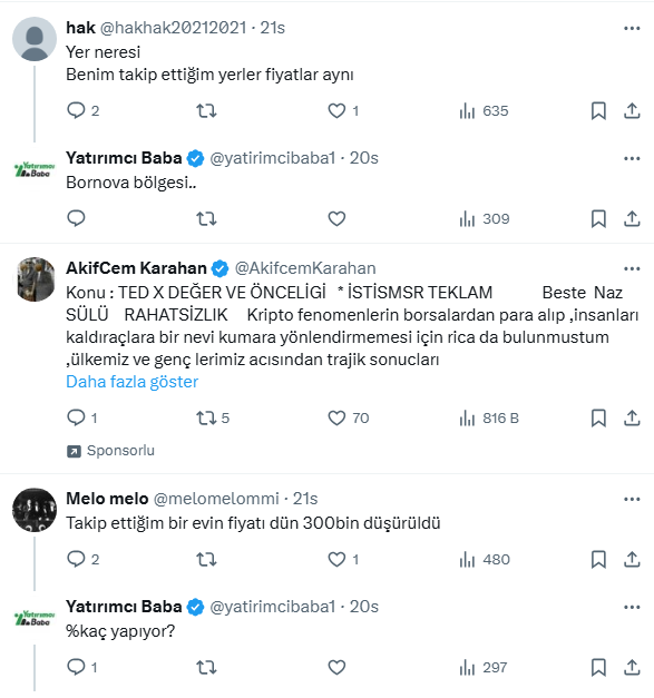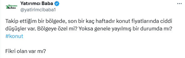 Yatırımcı Baba isimli X sosyal medya kullancısı, konut fiyatlarında bir düşüş yaşandığını söyledi. Fakat bu düşüşlerin bölgesel de olabileceğine dikkat çeken uzman isim sosyal medya hesabından vatandaşlara fikrini sordu.