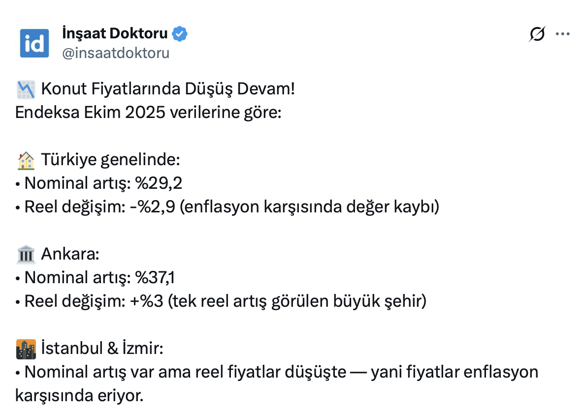 67,5 bin takipçili İnşaat Doktoru resmi sosyal medya hesabı üzerinden yaptığı paylaşımda konut fiyatlarının enflasyon karşısında eridiğini belirtti.