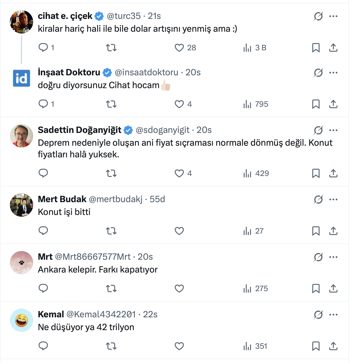 Emlak, inşaat ve konut sektörü ile ilgili yaptığı paylaşımlarla dikkat çeken 67,5 bin takipçili İnşaat Doktoru resmi X hesabı https://twitter.com/insaatdr üzerinden yaptığı paylaşımda konut fiyatlarının enflasyon karşısında eridiğini belirtti.