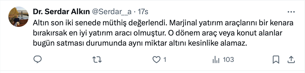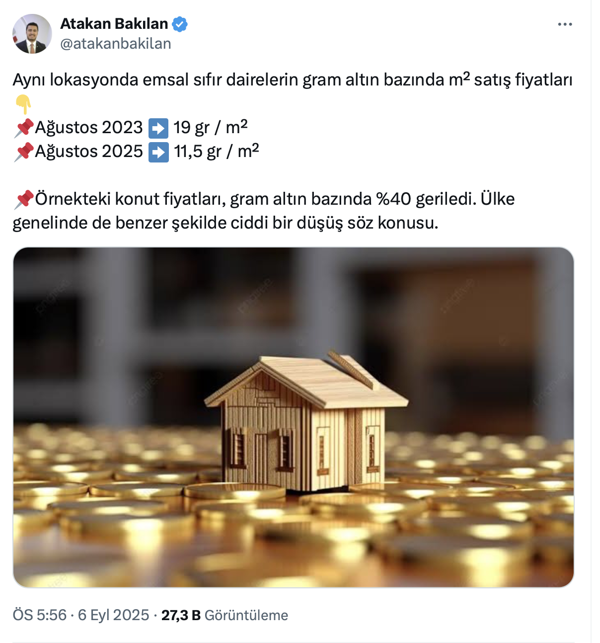 Atakan Bakılan paylaşımında konut fiyatlarının gram altın bazında yüzde 40 gerilediğini belirtti. İnşaat Mühendisi