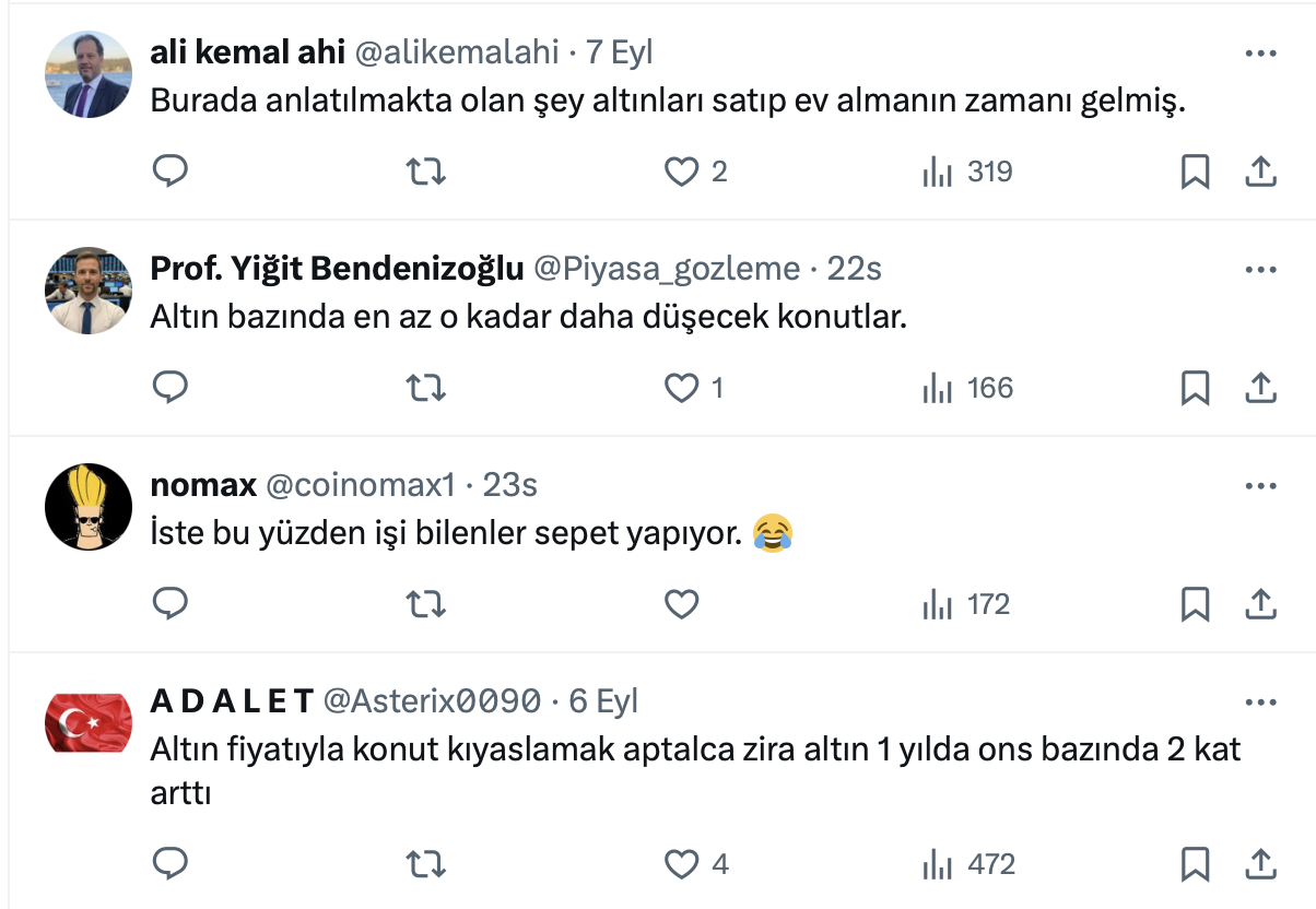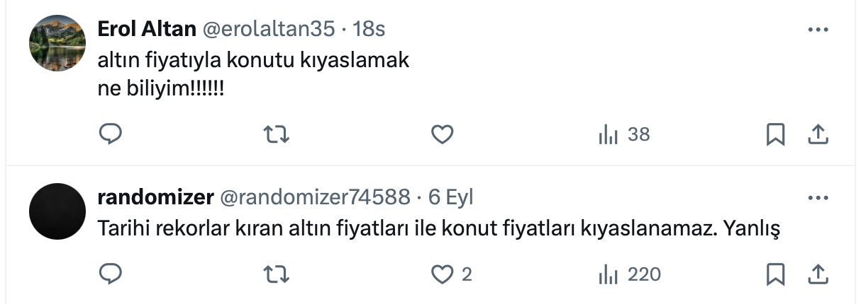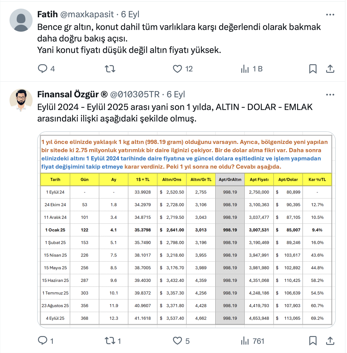 İnşaat Mühendisi Atakan Bakılan, resmi sosyal medya hesabı üzerinden yaptığı paylaşımda konut fiyatlarının gram altın bazında yüzde 40 gerilediğini belirtti.