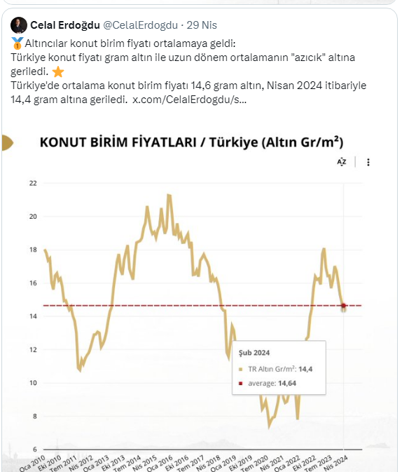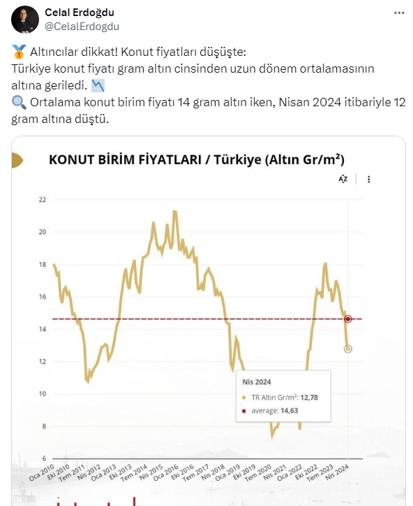Ortalama konut birim fiyatı 14 gram altın iken, Nisan 2024 itibariyle 12 gram altına düştü.