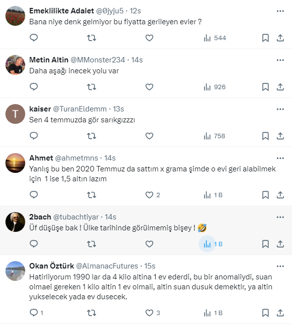 Altın fiyatları bugün yükselişe geçti. Son zamanlarda aşağı yönlü hareket eden altının ons fiytaı 2369 dolar oldu. Gram altın ise bugün 2498 liradan satılıyor. Şehir Plancısı ve Gayrimenkul Değerleme Uzmanı Celal Erdoğdu sosyal medya hesabındaan ortalaöa konut birim fiyatının kaç gram olduğunu açıkladı. Yatırımcılara seslenen Şehir Plancısı ve Gayrimenkul Değerleme Uzmanı Celal Erdoğdu konut fiyatlarının düşüşe geçtiğini açıkladı. Erdoğdu, ortalama konut birim fiyatının nisan itibariyle 12 gram altına düştüğünü açıkladı. İşte Erdoğdu'nun o paylaşımı ve gelen yorumlar...