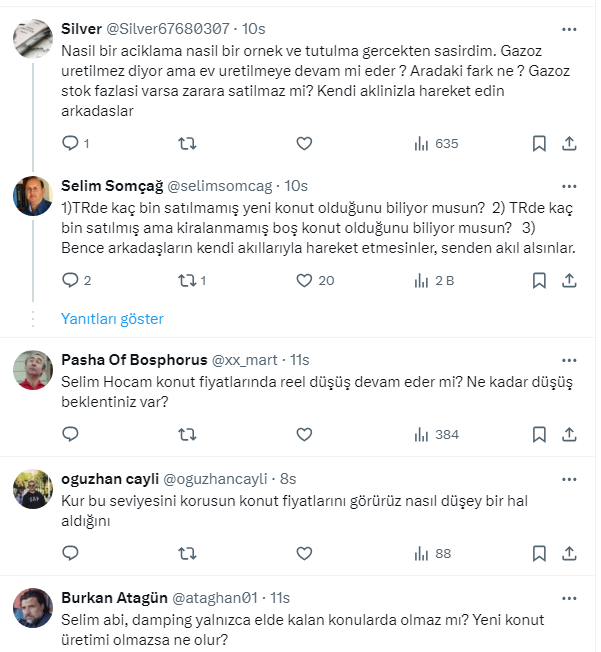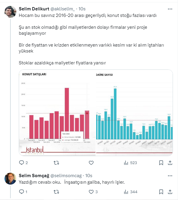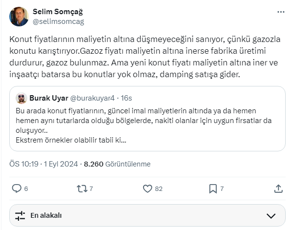 Somçağ, sosyal medya hesabı X'ten 'konut fiyatolarının maliyetin altına düşer ve inşaatçı batarsa bu konutlar yok olmaz, damping satışa gider.' dedi. İşte Somçağ'ın sosyal medya hesabı x'ten yaptığı o paylaşım...