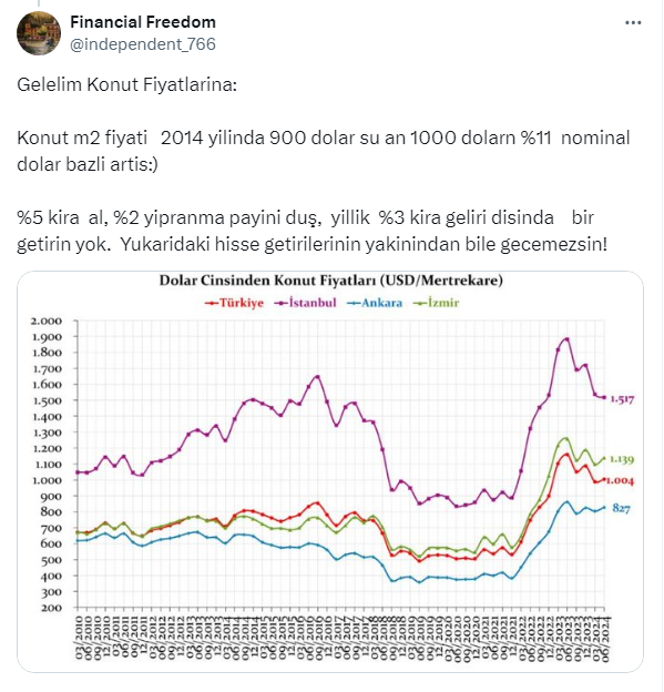 Finansal Freedom isimli analist, sosyal medya hesabı X'ten metrekare bazlı konut fiyatlarındaki artışa değindi. Analist, konut metrekare fiyatının 2014 yılında 900 dolar olduğunu şu anda ise 1000 dolara yükseldiğini açıkladı. Son 10 yılda konut metrekare fiyatının nominal dolar bazlı yüzde 11 oalrak arttığını belirtti.