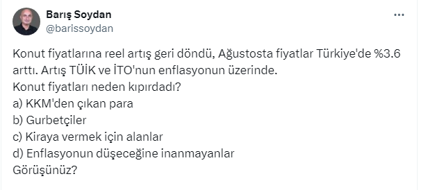Açıklanan rakamlar üzerine Ekonomist Barış Soydan, https://x.com/barissoydan X sosyal medya hesabından yaptığı paylaşımda takipçilerine konut fiyatlarındaki artışla ilgili görüşlerini sordu.