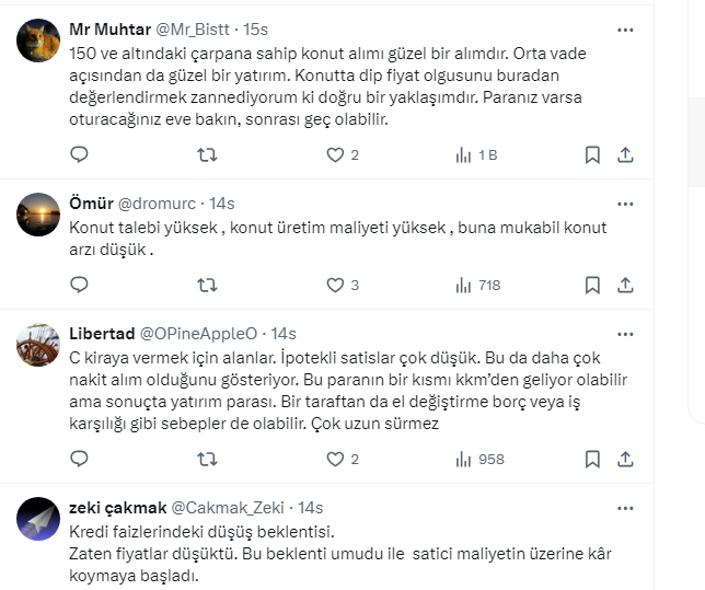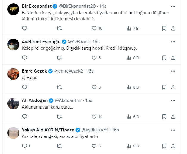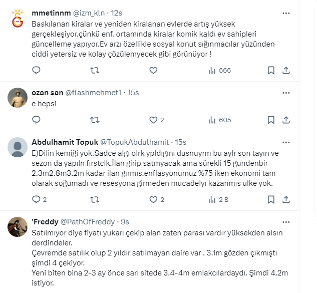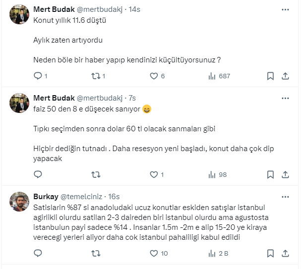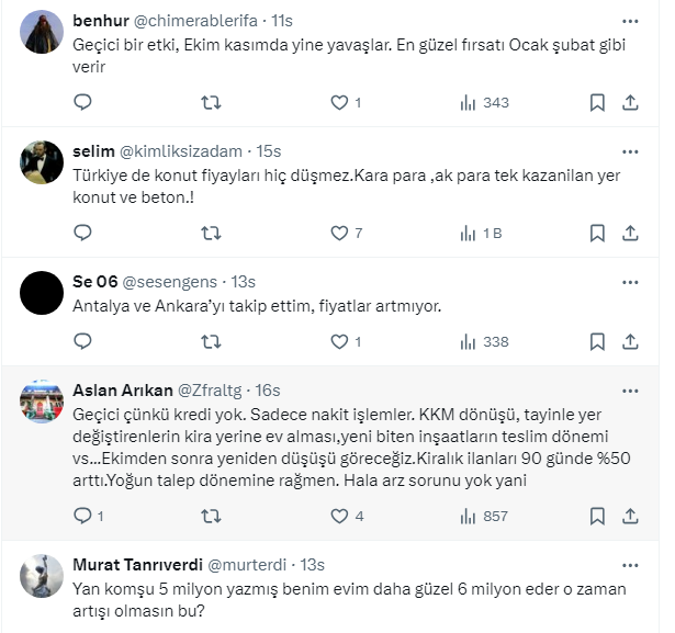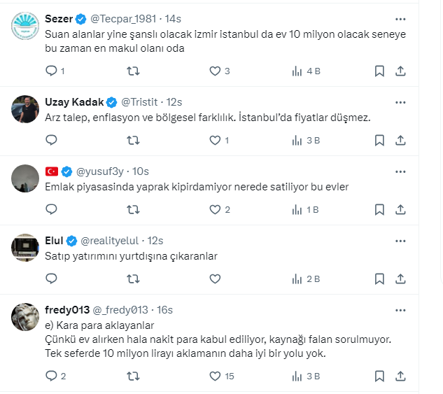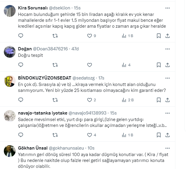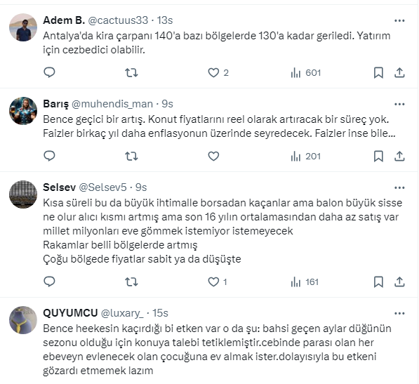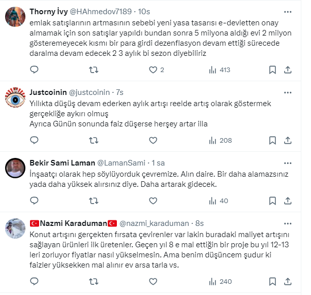 Takipçilerden gelen yorumlarda rakamların gerçeği yansıtmadığını söyleyen de oldu, kiraların yükselmesi nedeniyle ev alanların olduğuğunu söyleyen de. Bazı takipçiler de mevduattaki paranın yeniden konuta yöneldiğini ifade etti.