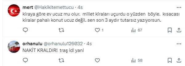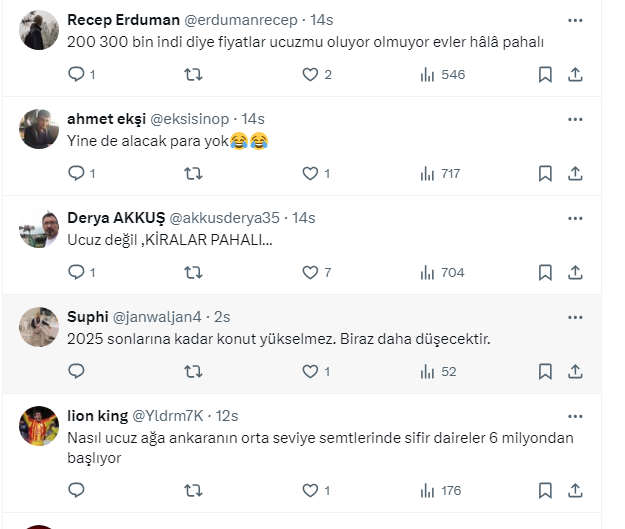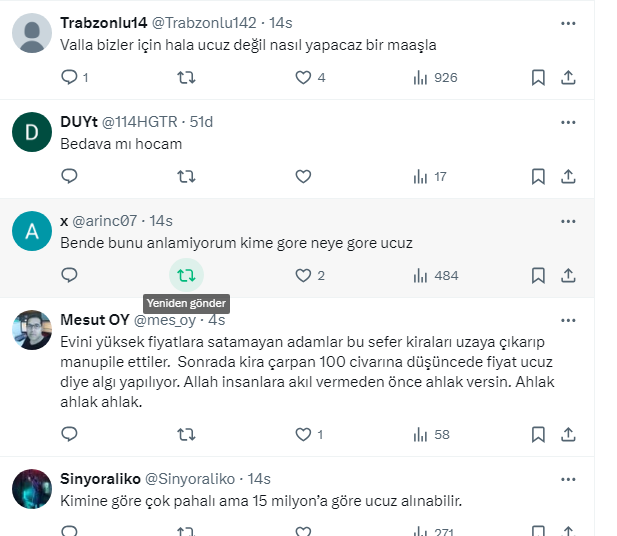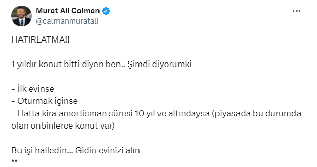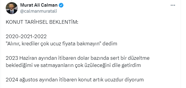 Bir yıldır konut piyasasının bittiğini söyleyen analist ve kripto fenomeni Murat Ali Calman, https://x.com/calmanmuratali X sosyal medya hesabından yaptığı paylaşımda, 2024 ağustos ayından itibaren konut fiyatları için artık ucuzdur diyerek, oturmak için ev alacakların almasını tavsiye etti. Calman yatırımcıya da kira amortisman süresi 10 yılın altındaki evlerini almaları önerisinde bulundu.