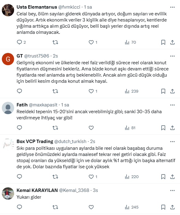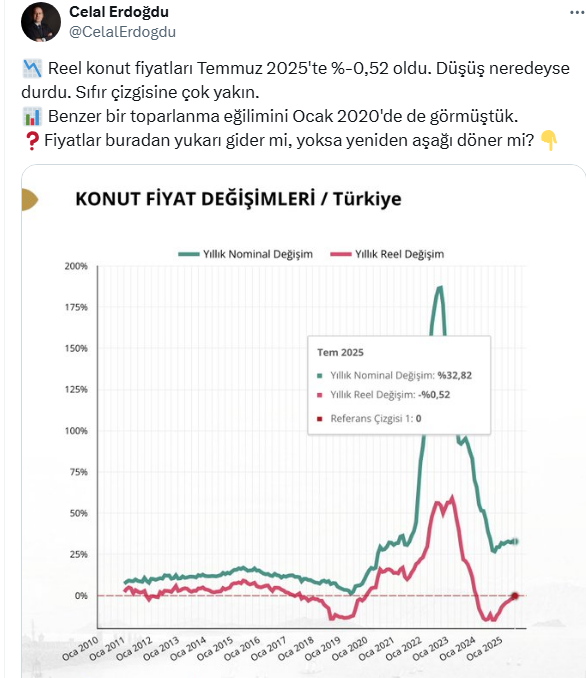 Erdoğdu, konut fiyatlarındaki bu düşüşüş tablosunun 5 yıl önce de görüldüğünü söyledi. İşte Celan Erdoğan'ın sosyal medya hesabı X'ten yaptığı o paylaşım...