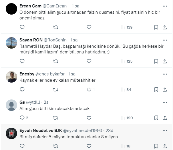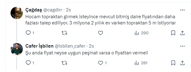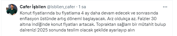 Açıklanan rakamlar üzerine konut fiyatlarıyla ilgili bir değerlendirme yapan analist ve stratejist Cafer İşbilen, konut alacakları uyardı. İşbilen https://x.com/isbilen_cafer X sosyal medya hesabından yaptığı paylaşımda, “Konut fiyatlarında bu fiyatlama 4 ay daha devam edecek ve sonrasında enflasyon üstünde artış dönemi başlayacak. Arz oldukça az. Faizler 30 altına indiğinde konut fiyatları artacak. Topraktan sağlam bir mütahit bulup dairenizi 2025 sonunda teslim olacak şekilde ayarlayıp alın” tavsiyesinde bulundu.