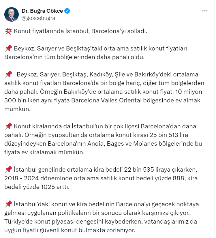 Buğra Gökce resmi X hesabı http://twitter.com/gokcebugra üzerinden yaptığı paylaşımda Beykoz, Sarıyer ve Beşiktaş’taki ortalama satılık konut fiyatlarının Barcelona’nın tüm bölgelerinden daha pahalı olduğunu belirtti.