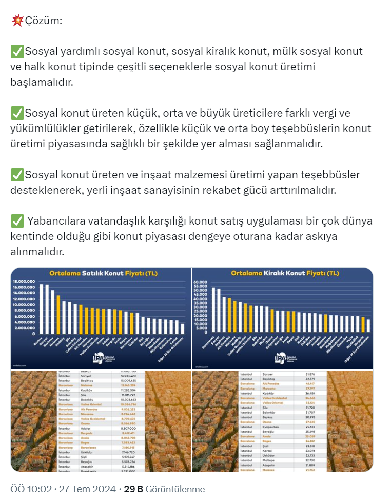 - İstanbul'daki konut ve kira bedelinin Barcelona'yı geçecek noktaya gelmesi uygulanan politikaların bir sonucu olarak karşımıza çıkıyor. Türkiye'de konut piyasası dengesini kaybederken, vatandaşlarımız da uygun fiyatlı güvenli konut bulmakta zorlanıyor.
