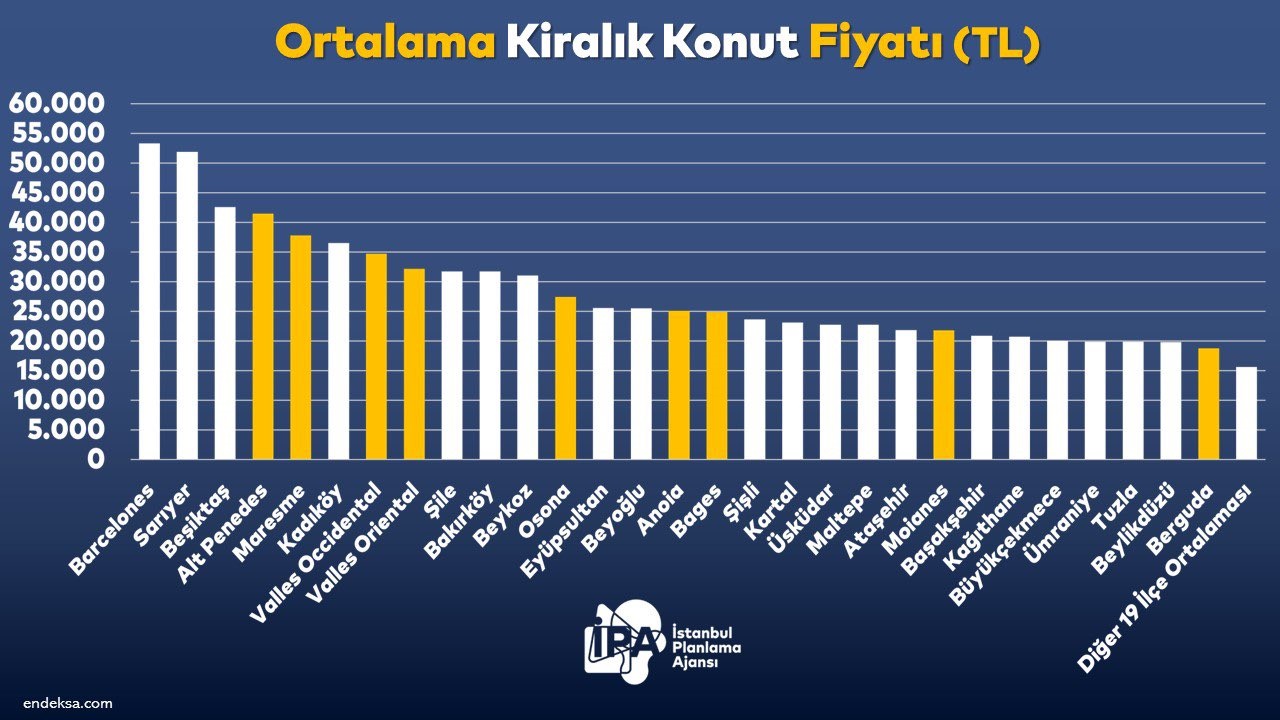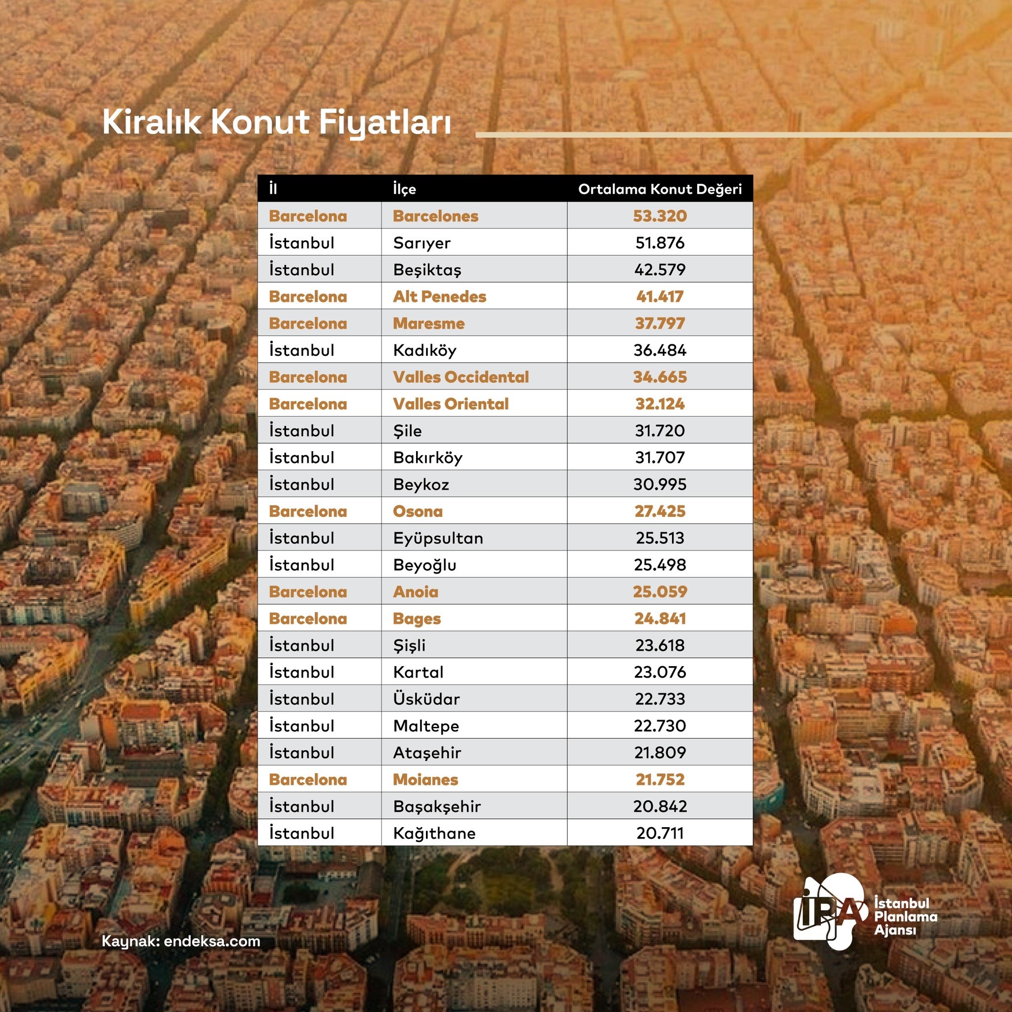 - Konut kiralarında da İstanbul'un bir çok ilçesi Barcelona'dan daha pahalı. Örneğin Eyüpsultan'da ortalama konut kirası 25 bin 513 lira düzeyindeyken Barcelona'nın Anoia, Bages ve Moianes bölgelerinde bu fiyata ev kiralamak mümkün.
