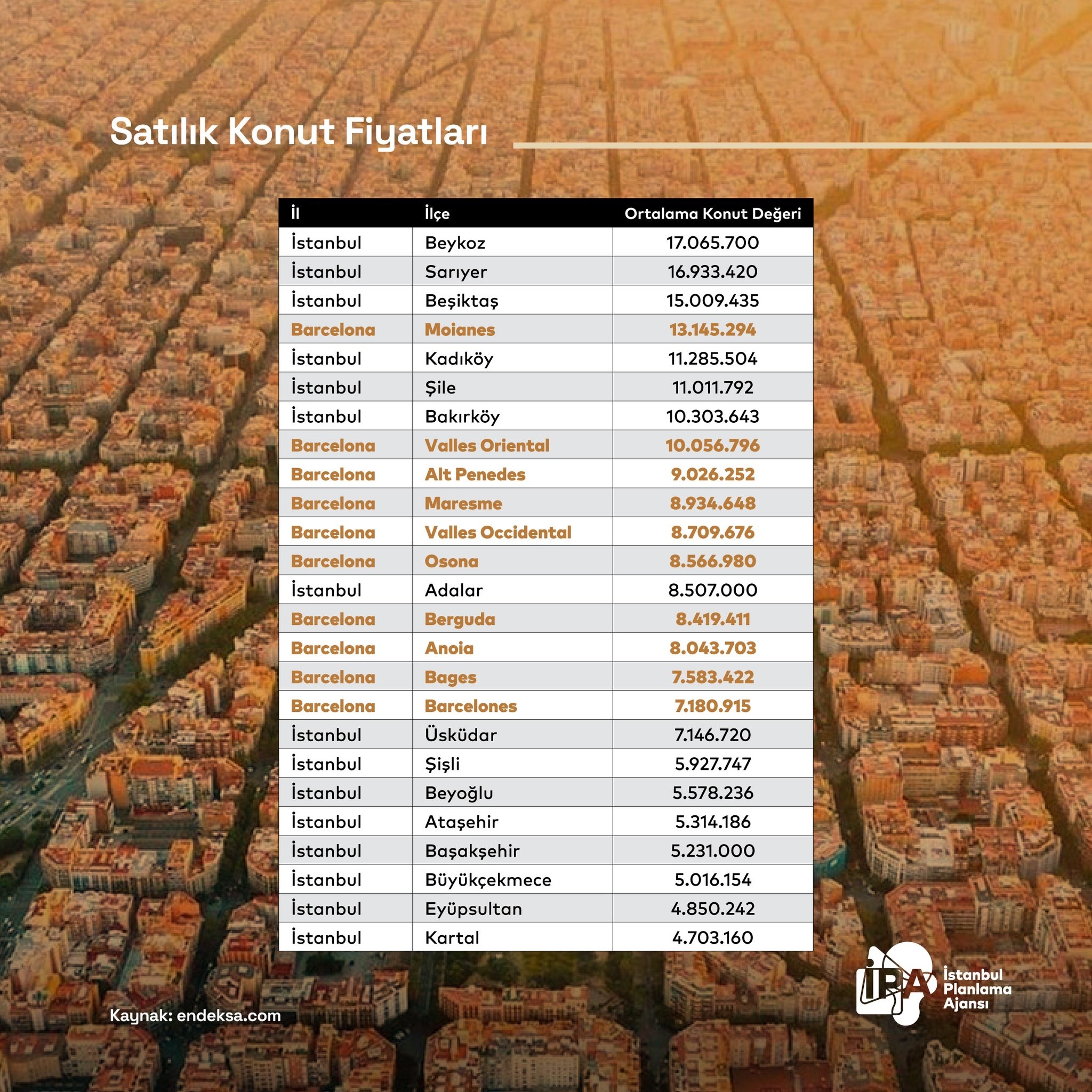 - Beykoz, Sarıyer, Beşiktaş, Kadıköy, Şile ve Bakırköy'deki ortalama satılık konut fiyatları Barcelona'da bir bölge hariç, diğer tüm bölgelerden daha pahalı. Örneğin Bakırköy'de ortalama satılık konut fiyatı 10 milyon 300 bin iken aynı fiyata Barcelona Valles Oriental bölgesinde ev almak mümkün.