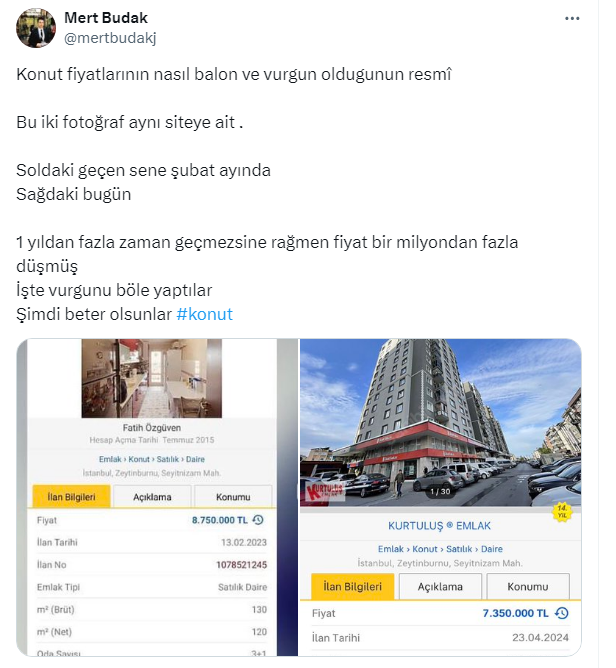 Konut fiyatlarındaki fahiş artış devam ederken, vatandaşlar konut almakta zorlanıyor. Her geçen sene yükselenen fiyatlar adeta dudak uçuklaştırken, ünlü turizmci Mert Budak sosyal medya hesabından konut fiyatlarında nasıl balon olduğunu iki ilanla kanıtladı. Budak, sosyal medya hesabından aynı sitede yer alan iki ayrı ilanın bir yıl önceki fiyatı ile kıyaslayarak, 'İşte vurgunu böyle yaptılar'' diyerek açıkladı. İşte Mert Budak'ın o paylaşımı ve vatandaşlardan gelen yorumlar...
