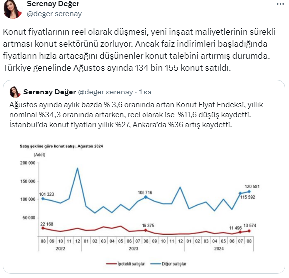 Sektör temsilcileri de, faizlerin düşmesi ile konut fiyatlarını yükseleceğini söylerken, vatandaşlar tekrar konuta yöneldi. Eski Bankacı Serenay Değer, sosyal medya hesabından, konut fiyatlarındaki hareketliliği değerlendirdi.