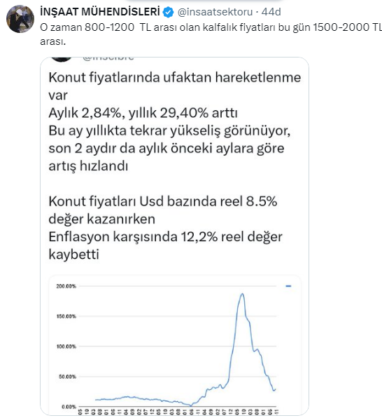 İris Cibre'nin paylaşını alıntılayan İnşaat Mühendisleri ise ''O zaman 800-1200 TL arası olan kalfalık fiyatları bu gün 1500-2000 TL arası.'' yorumunu yaptı. İşte İnşaat mühendislerinin sosyal meyda hesabı X'ten yaptığı o paylaşım....