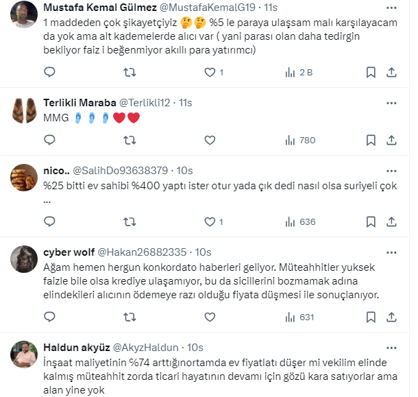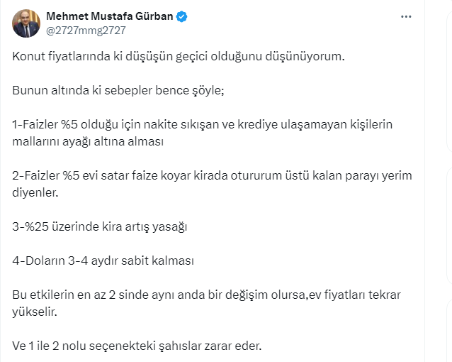İyi Parti Gaziantep Milletvekili Mehmet Mustafa Gürban, kendisine yöneltilen, dolar bazında konut fiyatlarının düşmeye devam edip etmeyeceğiyle ilgili soruya https://twitter.com/2727mmg2727 X sosyal medya hesabından cevap verdi. Gürban konut fiyatlarındaki düşüşün geçici olduğunu düşündüğünü belirterek nedenlerini açıkladı. Kredi faizlerinin yüksekliği nedeniyle fiyatlarda düşüş göründüğünü söyleyen Gürban, parasını mevduata yatıranların bu süreç sonunda zarar edeceğini belirtti.