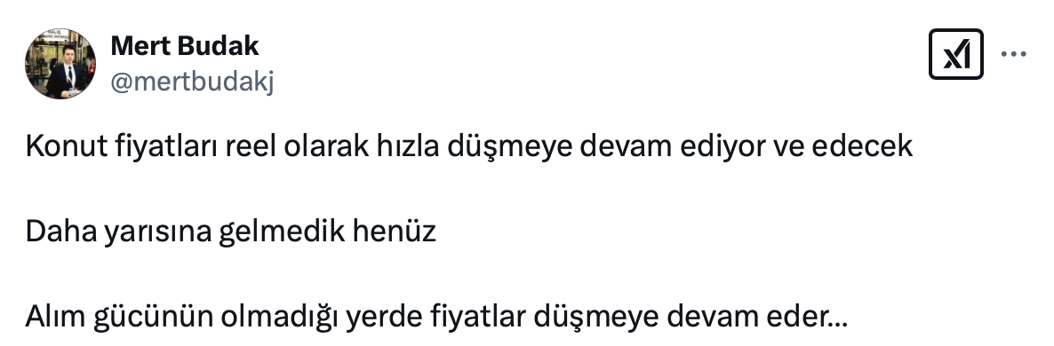 Konut piyasasıyla ilgili olarak çok önemli bazı değerlendirmeler yapan Girişimci Mert Budak resmi sosyal medya hesabı https://x.com/mertbudakj üzerinden yaptığı paylaşımda konut fiyatlarının reel olarak düşmeyi sürdüreceğini kaydetti.