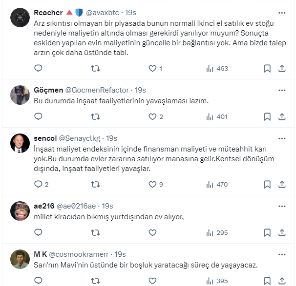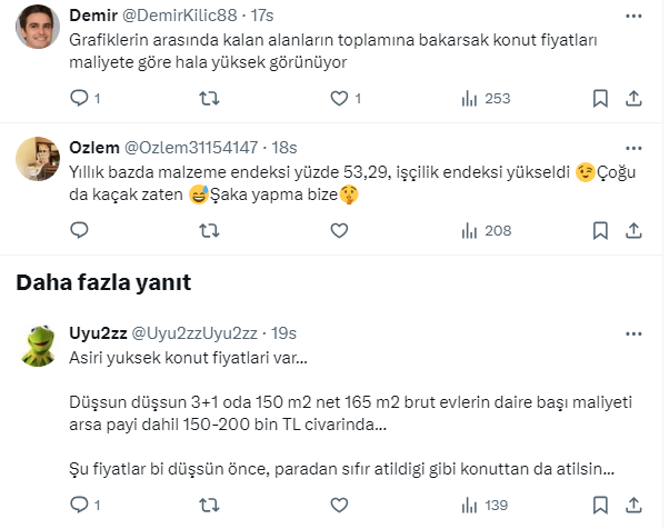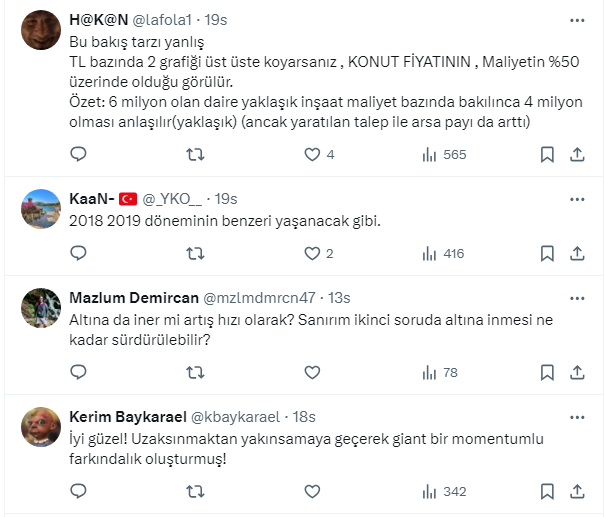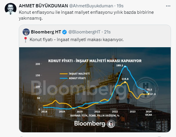 Gayrimenkul Değerleme Uzmanı Dr. Ahmet Büyükduman https://twitter.com/AhmetBuyukduman X sosyal medya hesabından konut fiyatları ile maliyetlerdeki artış hızını gösteren bir grafik paylaştı. Büyükduman, konut enflasyonu ile inşaat maliyet enflasyonunun yıllık bazda birbirine yakınlaştığını söyledi. Takipçiler, arsa payı ve müteahhit karı konulunca ev maliyetlerinin de artacağını belirterek, ev fiyatlarının ucuz olduğunu söyleyen de oldu.
