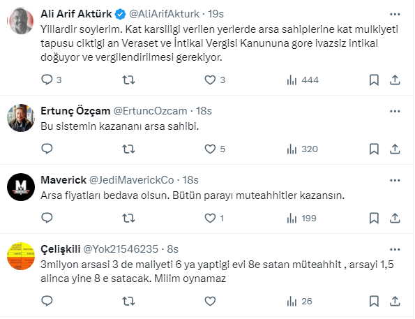 Güler'in açıklamasının ardından İnşaat Mühendisi Atakan Bakılan da konut fiyatlarını belirleyen en önemli unsurun arsa fiyatları ile kat karşılığı oranları olduğunu açıkladı. Bakılan, sosyal medya hesabından arsa payına göre 100 metrekare konutun maliyetini hesapladı.