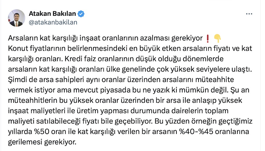 İnşaat Mühendisi, Atakan Bakılan yaptığı paylaşımda konut fiyatlarının düşmesi için arsaların kat karşılığı inşaat oranlarının azalması gerektiğini söyledi.