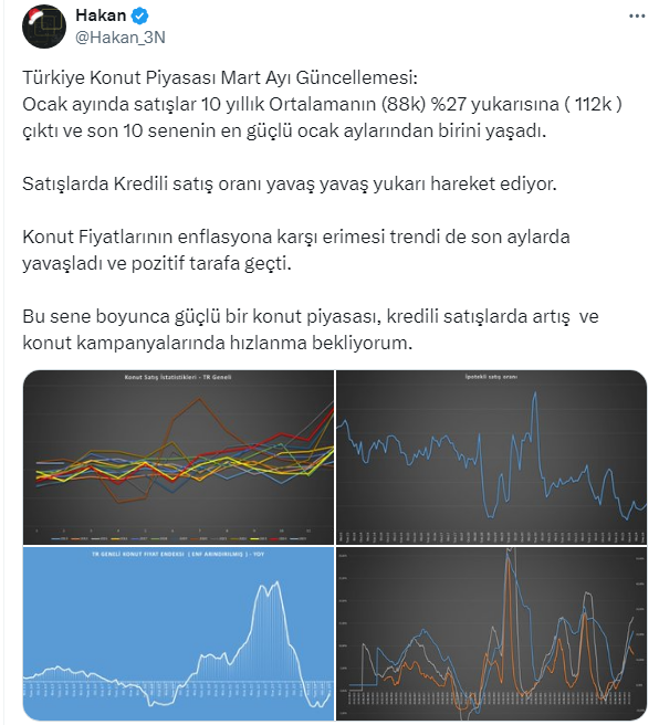 Öte yandan konut kredilerinde artış beklediğini belirten Hakan 3N isimli twitter kullanıcısı, bu sene boyunca güçlü bir konut piyasası, kredili satışlarda artış ve konut kampanyalarında hızlanma beklediğini açıkladı.