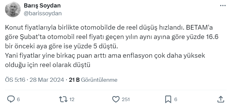 Ekonomist Barış Soydan resmi sosyal medya hesabı https://twitter.com/barissoydan üzerinden yaptığı paylaşımda konut fiyatlarıyla birlikte otomobilde de reel düşüş hızlandığını belirterek, "BETAM'a göre Şubat'ta otomobil reel fiyatı geçen yılın aynı ayına göre yüzde 16.6 bir önceki aya göre ise yüzde 5 düştü." ifadelerini kullandı.