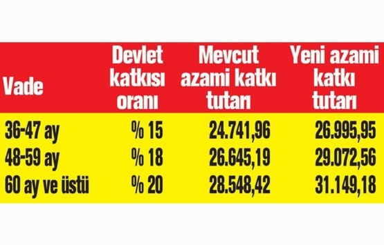 Devlet katkısı tavanı 28 bin 548 liradan 31 bin 149 liraya çıkacak. 5 yıl veya daha uzun sürede 155 bin 745 lira biriktiren, ev almak istediğinde 31 bin 149 lira katkı alabilecek.