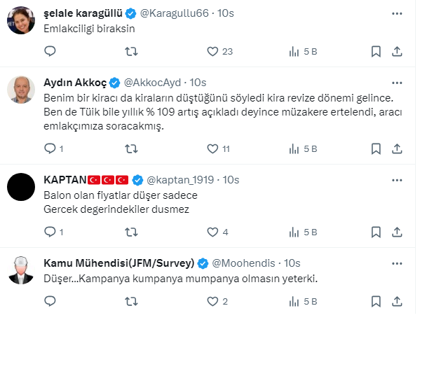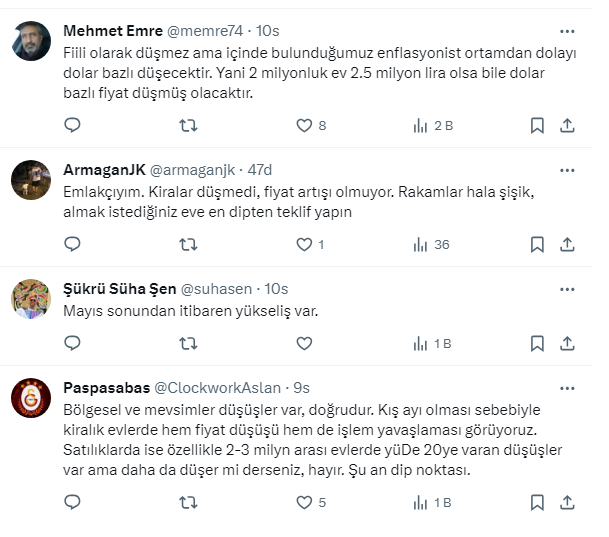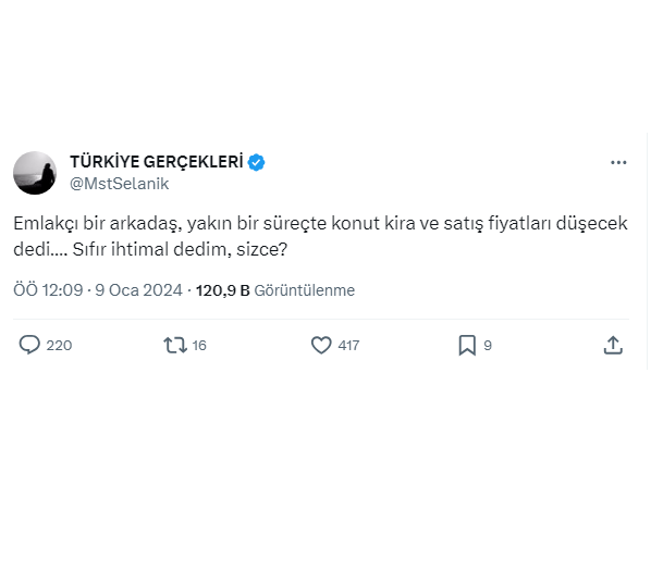 ArmaganJK @armaganjk: ''Emlakçıyım. Kiralar düşmedi, fiyat artışı olmuyor. Rakamlar hala şişik, almak istediğiniz eve en dipten teklif yapın.''