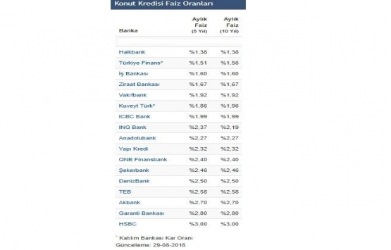 Halkbank 10 yıllık kredi kullanacaklara yüzde 1,38, Türkiye Finans yüzde 1,56, İş Bankası yüzde 1,60, Ziraat Bankası yüzde 1,67, Vakıfbank yüzde 1,92, Kuveyt Türk yüzde 1,96, ICBC Bank yüzde 1,99 faiz oranı uyguluyor.