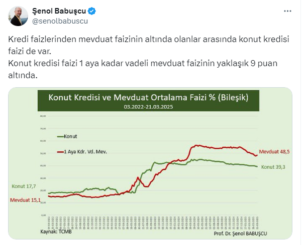 Başkent Üniversitesi Uluslararası Finans ve Bankacılık Bölüm Başkanı Prof. Dr. Şenol Babuşcu sosyal medya hesabından kredi faizlerinden mevduat faizinin altında olanlar arasında konut kredisi faizinin olduğunu açıkladı. İşte Babuşçu'nun o paylaşımı...
